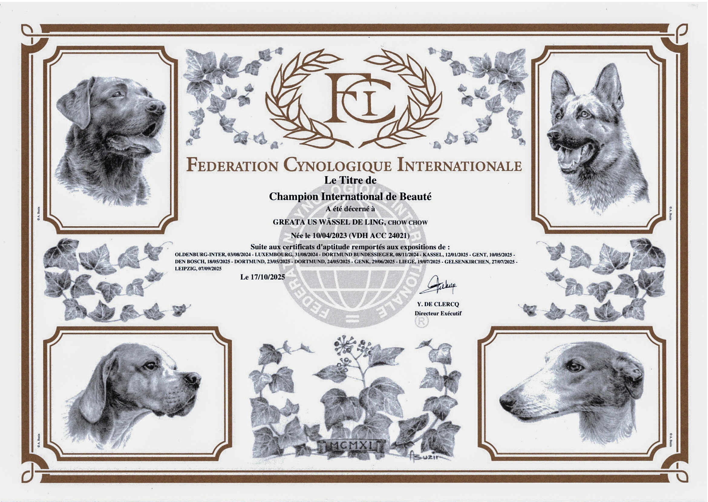 V1, gewann die Anw. Dt. Ch. VDH, das Club-CAC, das FCI-CACIB und wurde Bundessiegerin sowie BOS.