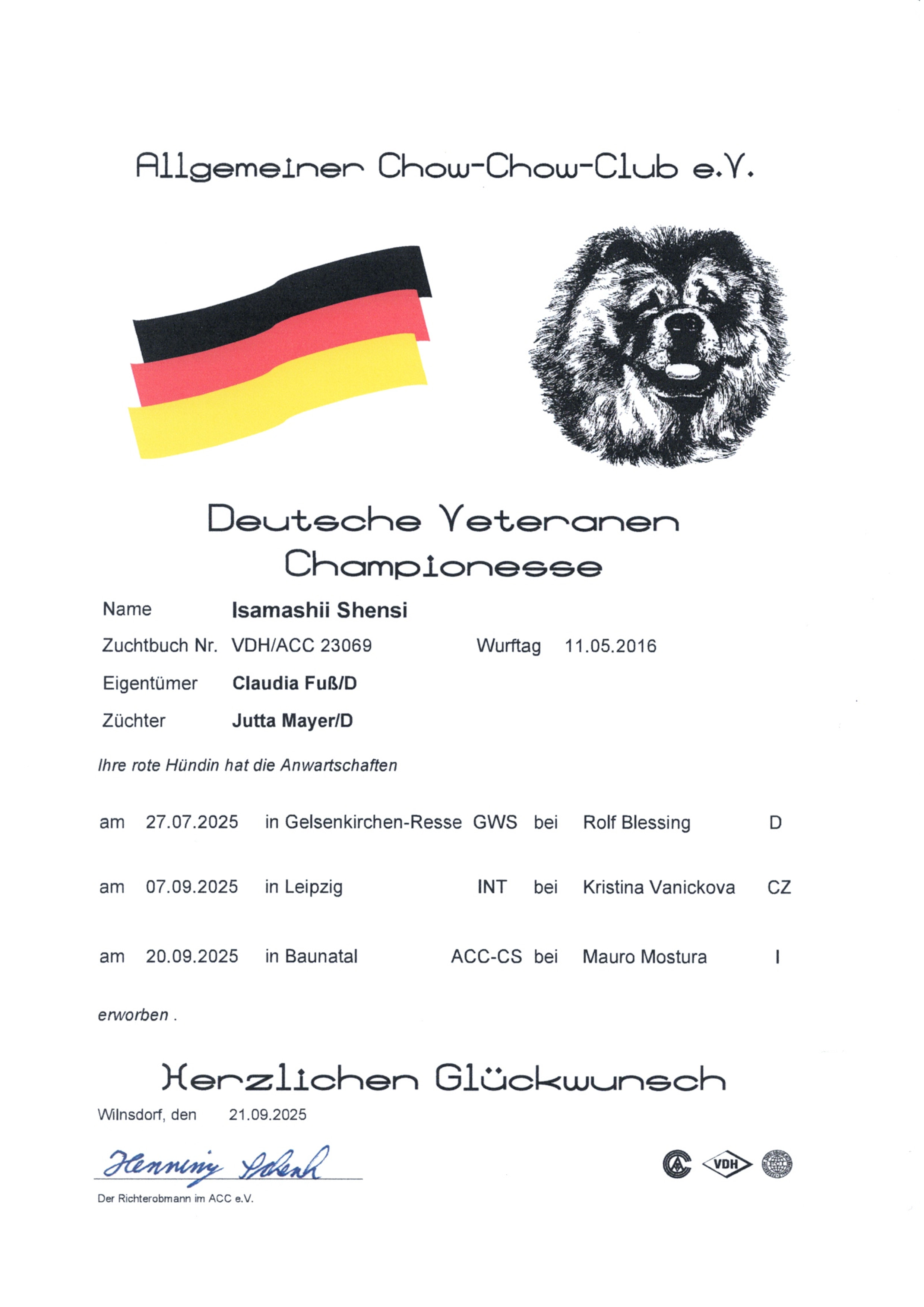 V1, gewann die Anw. Dt. Vet. Ch. VDH, das Club-Vet. CAC, das FCI-CACIB-Vet. und wurde Bundes-Veteranensiegerin.