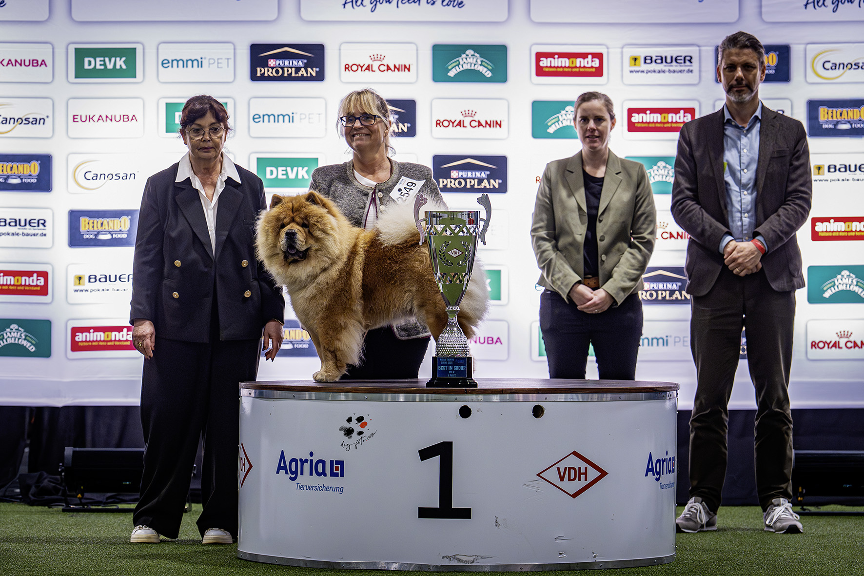 Greata erreicht im Finale des German Dog of the Year den sechsten Platz. Ein tolles Ergebnis und das beste, welches ein Chow Chow jemals in diesem Wettbewerb erringen konnte. Die ersten sechs Plätze wurden am Samstag im Rahmen eines festlichen Dinners vergeben. Für uns war das ein sehr schönes Erlebnis, was aber dazu führte, dass wir erst um Mitternacht wieder zuhause waren. Alles in allem war es sehr anstrengend, weil wir am nächsten Morgen um sechs schon wieder auf die Piste mussten, um an der Agria Trophy teilnehmen zu können. Unsere Schätze Isa und Greata haben sich den Richtern wieder einmal toll präsentiert und konnten voll überzeugen. Zum Abschluss des Wochenendes erreichte Greata am Sonntag im Ehrenring zusätzlich den Sieg in der Gruppe Fünf. Es war ein tolles Wochenende mit viel Wartezeit und großen Erfolgen für unser Team. Wir sind stolz und glücklich.