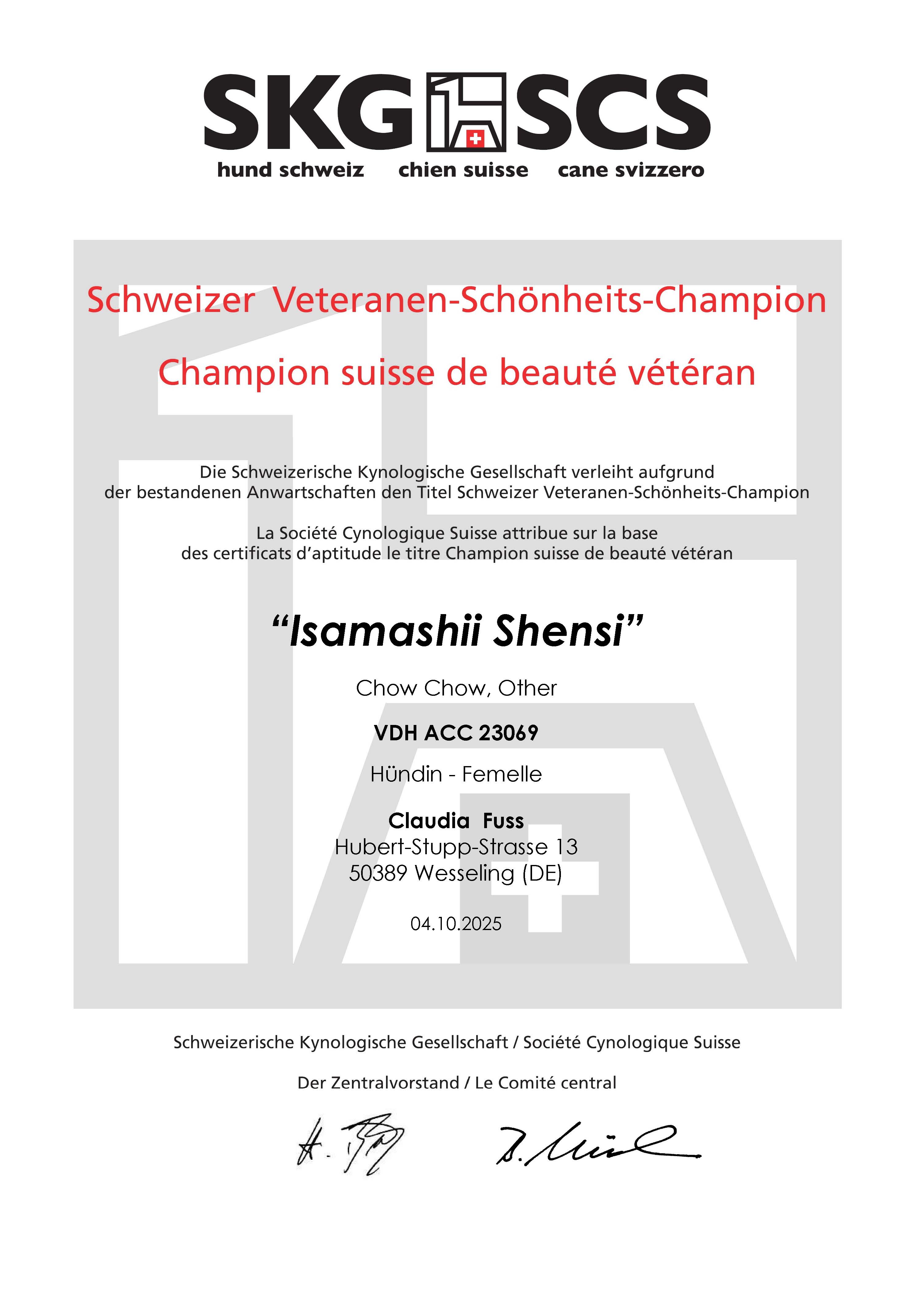 Mit diesen Ergebnissen sind Greata us Wässel de Ling nun Schweizer Ausstellungs-Champion und Isamashii Shensi Schweizer Veteranen-Schönheits-Champion.
