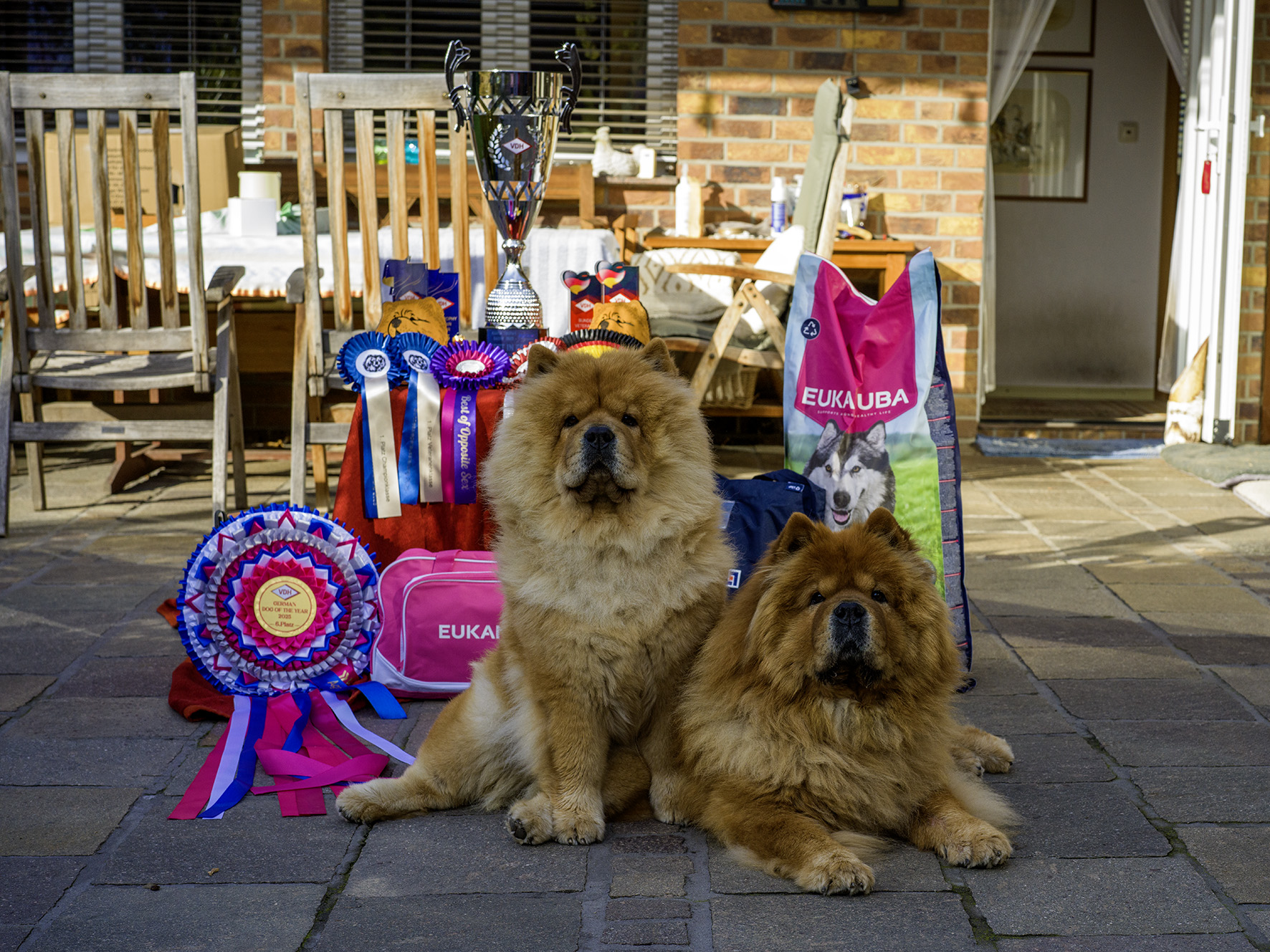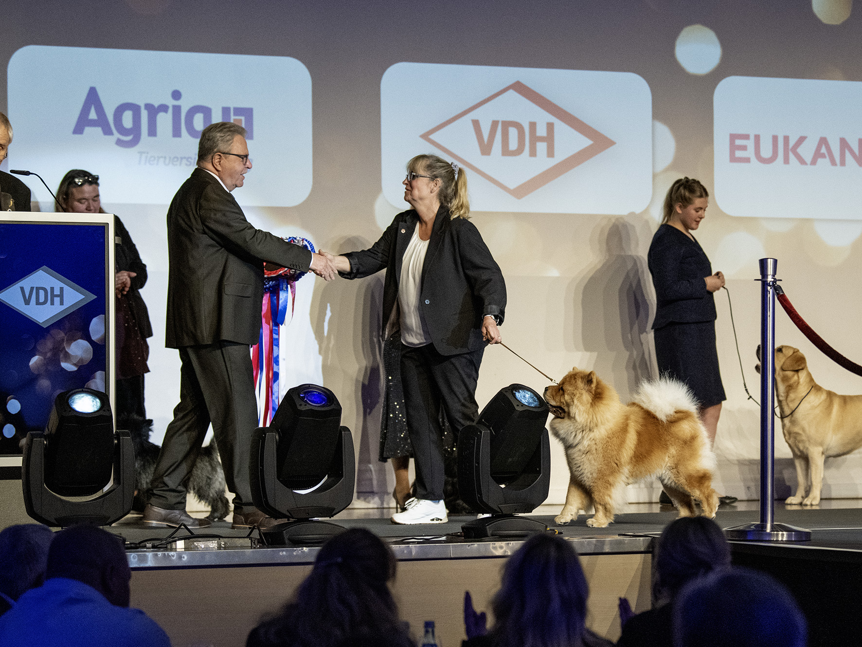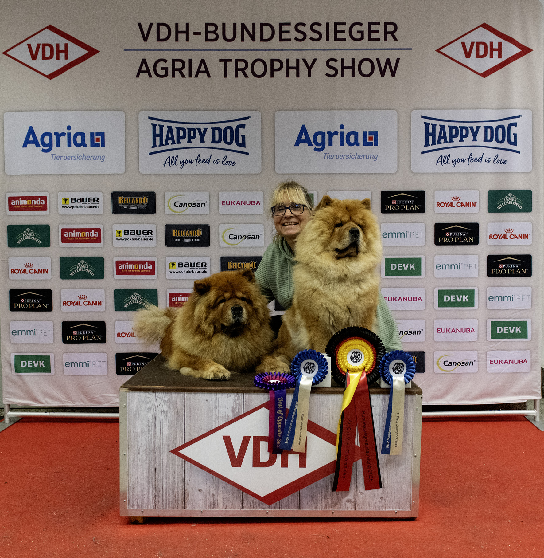 Greata erreicht im Finale des German Dog of the Year den sechsten Platz. Ein tolles Ergebnis und das beste, welches ein Chow Chow jemals in diesem Wettbewerb erringen konnte. Die ersten sechs Plätze wurden am Samstag im Rahmen eines festlichen Dinners vergeben. Für uns war das ein sehr schönes Erlebnis, was aber dazu führte, dass wir erst um Mitternacht wieder zuhause waren. Alles in allem war es sehr anstrengend, weil wir am nächsten Morgen um sechs schon wieder auf die Piste mussten, um an der Agria Trophy teilnehmen zu können. Unsere Schätze Isa und Greata haben sich den Richtern wieder einmal toll präsentiert und konnten voll überzeugen. Zum Abschluss des Wochenendes erreichte Greata am Sonntag im Ehrenring zusätzlich den Sieg in der Gruppe Fünf. Es war ein tolles Wochenende mit viel Wartezeit und großen Erfolgen für unser Team. Wir sind stolz und glücklich.