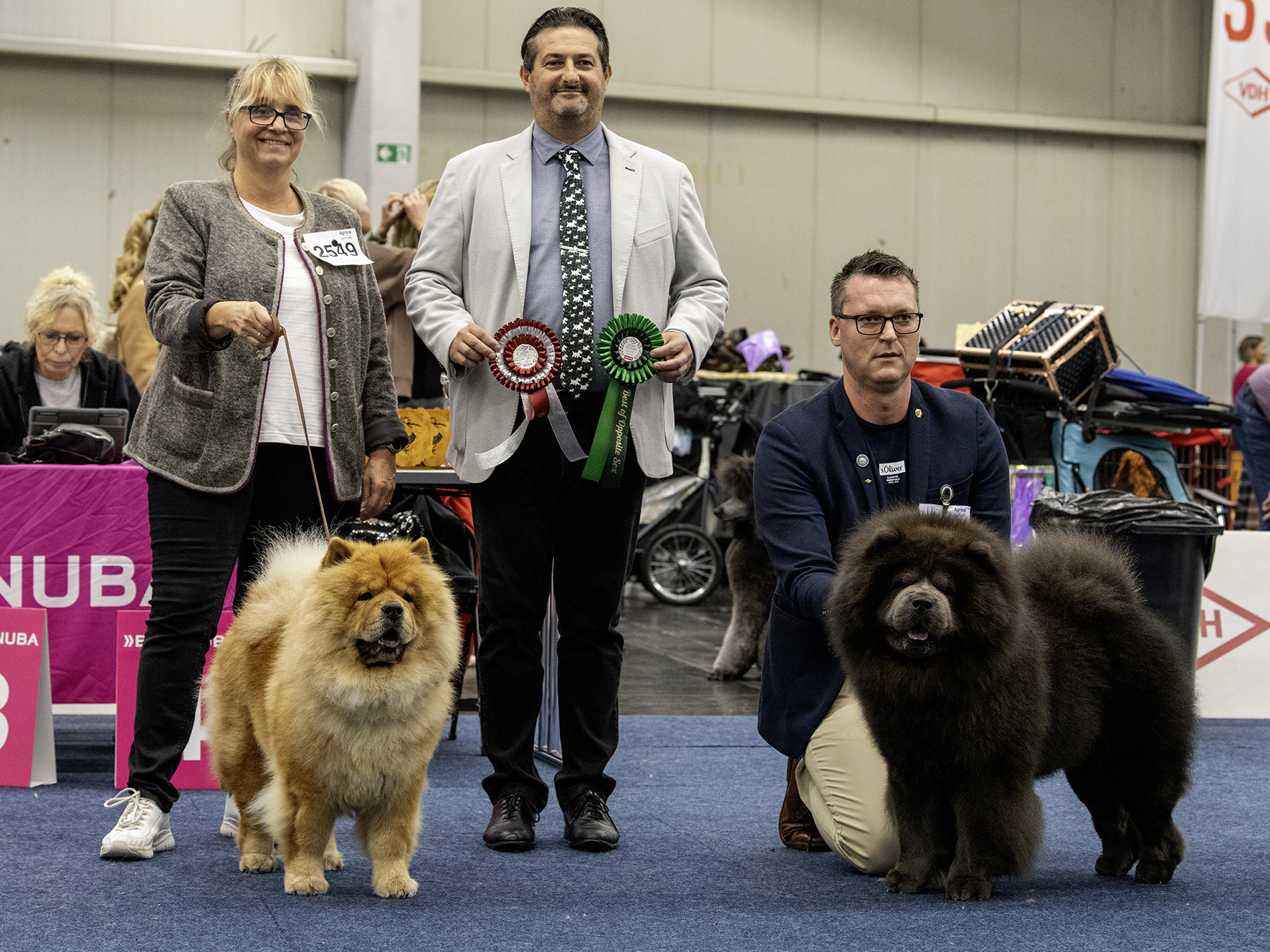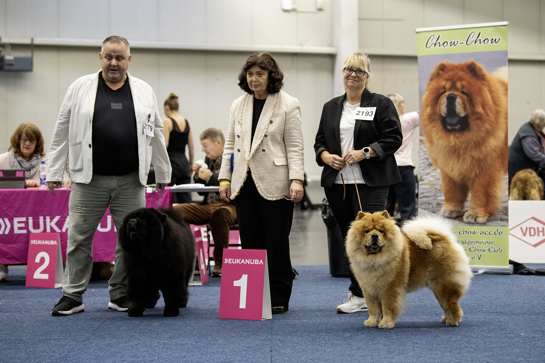 Besonders herausfordernd wird die Aufgabe, wenn es sich bei den ausgestellten Hunden um Chows handelt, die rassetypisch lieber ihren eigenen Kopf durchsetzen und es manchmal gar nicht so richtig einsehen wollen, dass sie immer bis fast zum Ende der Veranstaltung warten müssen, bis sie denn dann in den Ring dürfen.