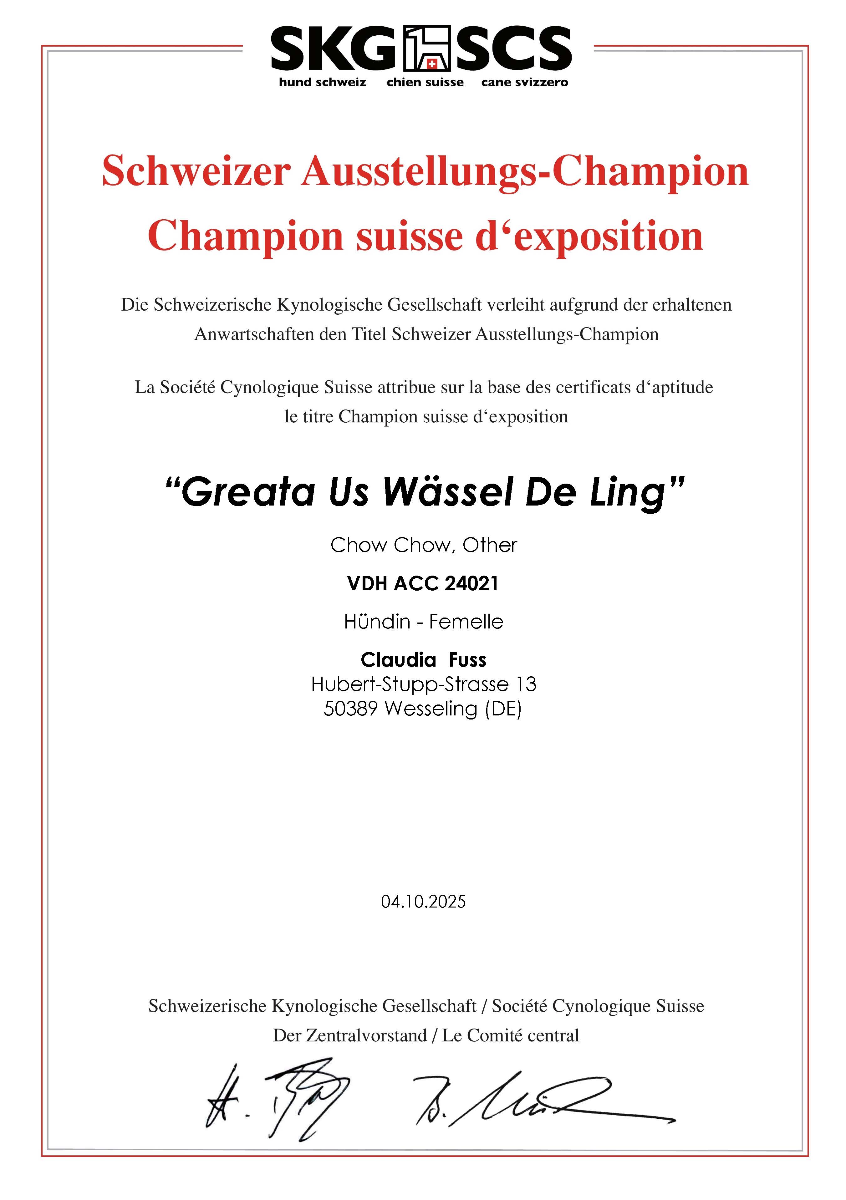 Mit diesen Ergebnissen sind Greata us Wässel de Ling nun Schweizer Ausstellungs-Champion und Isamashii Shensi Schweizer Veteranen-Schönheits-Champion.