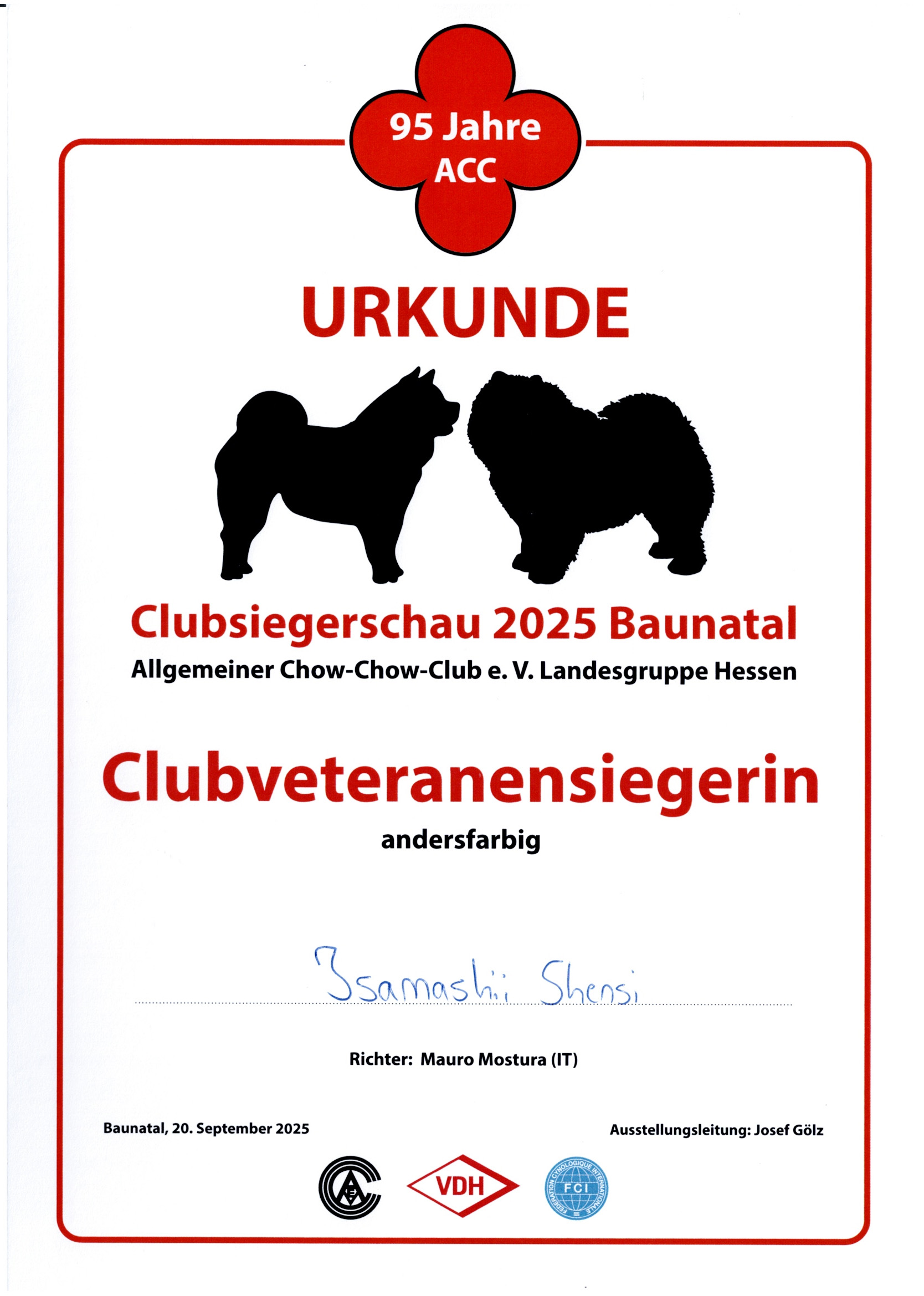 V1, erhielt das Club CAC , die Anw. Dt. Vet. Ch. VDH, und wurde Clubsiegerin, BOS und Hessensiegerin.